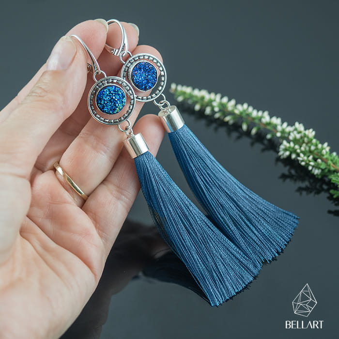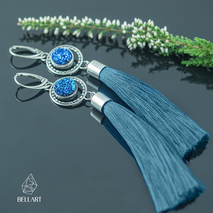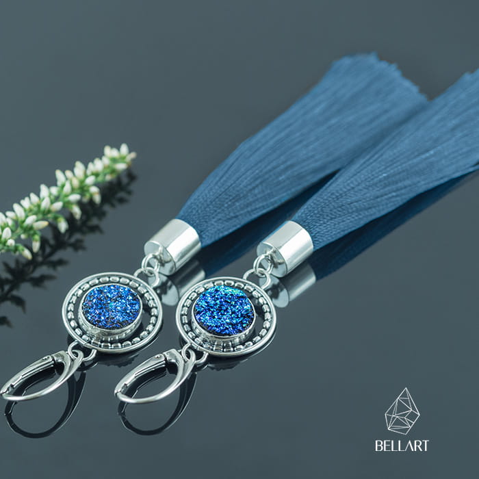 Eleganckie i nietuzinkowe kolczyki wykonane ręcznie ze srebra. Kolczyki ozdobione są druzami pokrytymi tytanem, na powierzchni których można zobaczyć poszczególne kryształki. Pod nimi znajduje się satynowy, niebieski chwost. Srebro jest lekko przyciemnione i wypolerowane na połysk tak aby podkreślić wzory. Kolor chwostów oraz kamieni idealnie się uzupełnia. Srebrne kolczyki z chwostami idealnie sprawdzą się na wyjątkowe okazje, wieczorne wyjścia lub gdy po prostu chcesz włożyć coś niepowtarzalnego. Ten kobiecy i nowoczesny dodatek wyróżni Cie wśród innych.