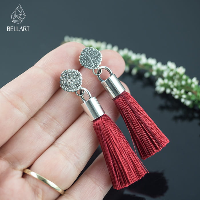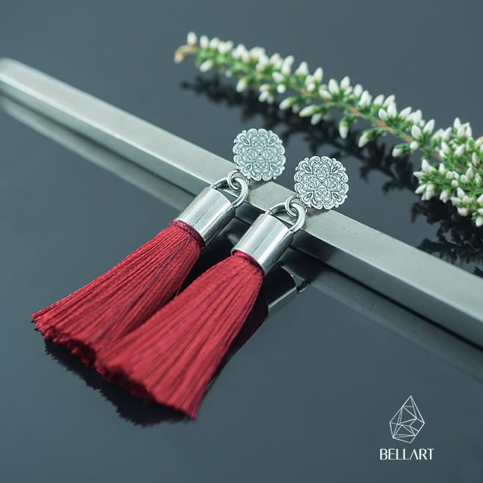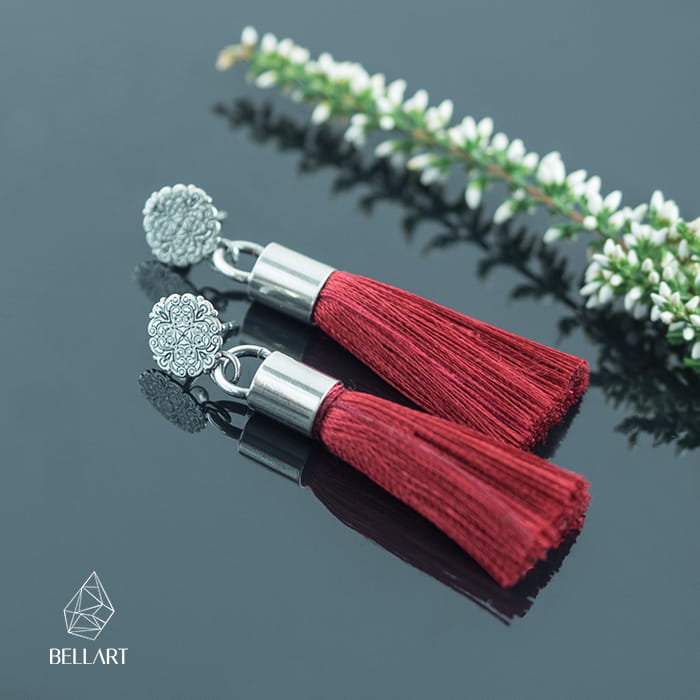 Lekkie i urokliwe kolczyki wykonane ręcznie ze srebra. Główna ozdobą są tu chwosty w pięknym bordowym kolorze. Srebrne sztyfty w postaci dekorowanego koła ślicznie prezentują się na uchu. Są one przyciemnione i wypolerowane na połysk tak aby podkreślić wzory. Bordowe chwosty przyciągają wzrok, a zarazem są wygodne. Ich długość pozwala swobodnie nosić je do pracy i na co dzień. Kolczyki z chwostami są efektownym i kobiecym dodatkiem, który wyróżni Cie z tłumu.