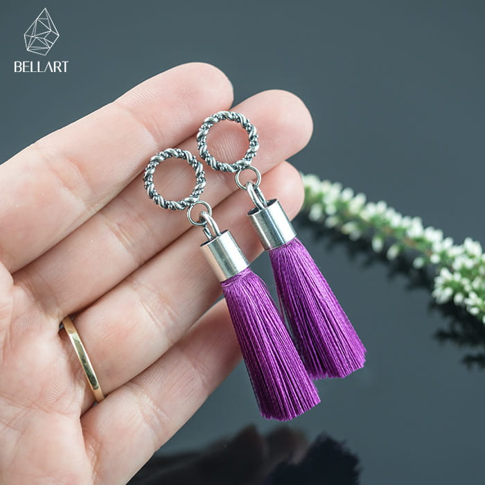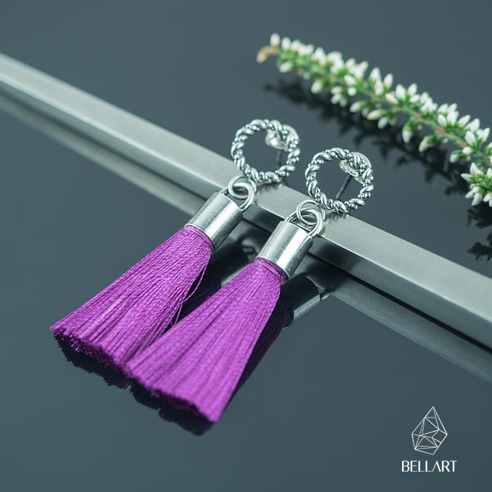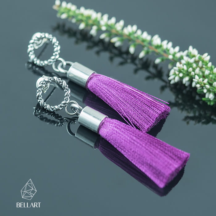 Lekkie i fantazyjne kolczyki wykonane ręcznie ze srebra. Główna ozdobą są tu chwosty w kolorze fuksji.Srebrne sztyfty w postaci ozdobnego koła śliczni prezentują się na uchu. Są one przyciemnione i wypolerowane na połysk. Kolorowe chwosty przyciągają wzrok, a zarazem są wygodne. Ich długość pozwala swobodnie nosić je do pracy i na co dzień. Kolczyki z chwostami są efektownym i nietuzinkowym dodatkiem, który wyróżni Cie z tłumu.