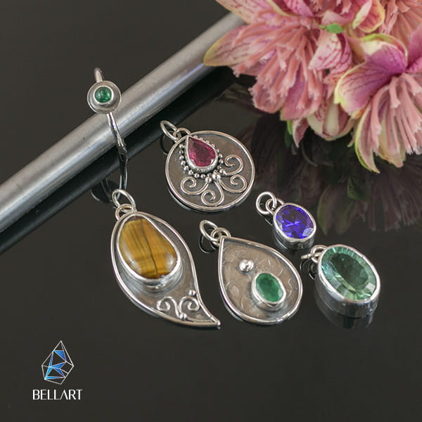 Materiały: szmaragd, rubin, cyrkonia, tygrysie oko, fluoryt, srebro próby 925 i 999.