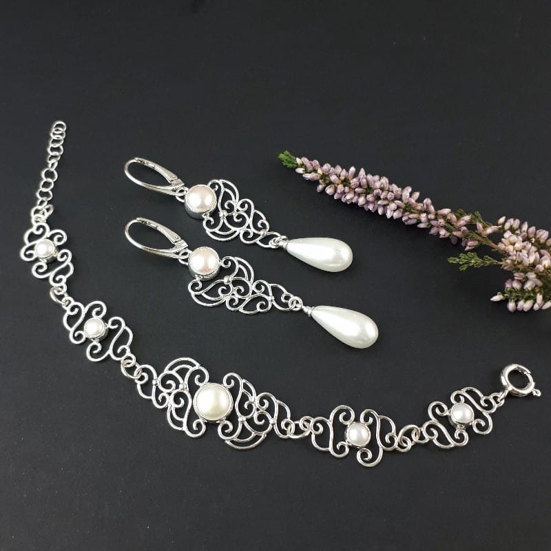 Srebrny ażurowy komplet z perłami