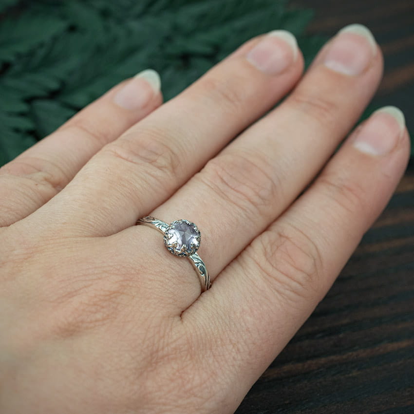 Wymiary: ametyst fasetowany (szlif rose cut) 6mm, szerokość obrączki 2 mm, rozmiar jubilerski 12.5-13 (średnica wewnętrzna ok. 16.5 mm).