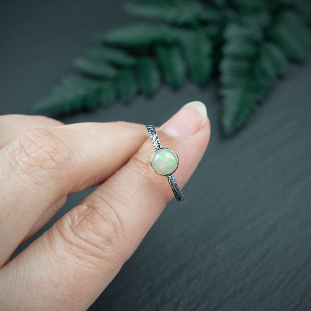 Wymiary: opal ok. 5 mm, szerokość obrączki ok. 2 mm, rozmiar jubilerski 14 - średnica wewn. obrączki około 17.2 mm