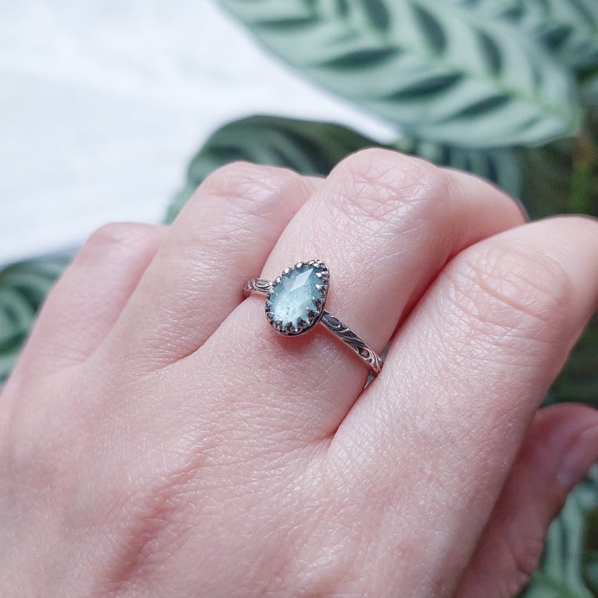 Wymiary: akwamaryn ok. 10x7 mm, rozmiar jubilerski 14.