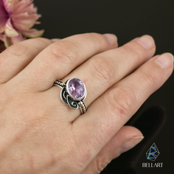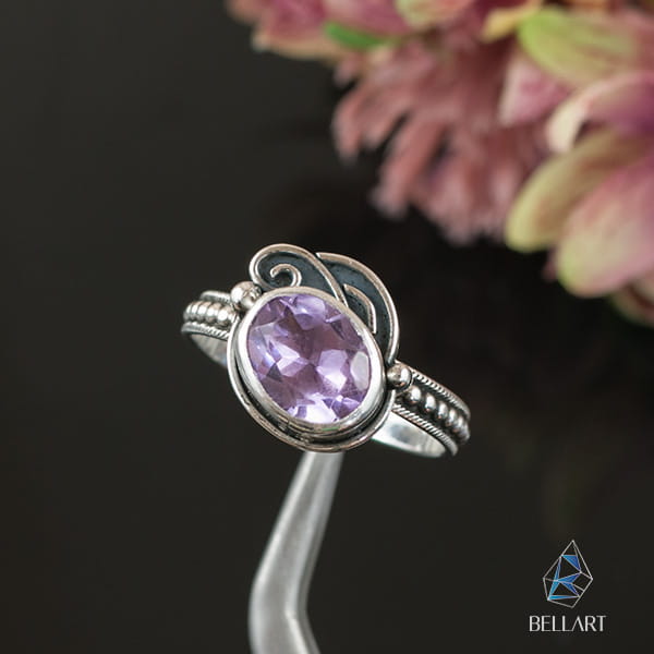 Srebrny pierścionek z fasetowanym ametystem i zawijasami wykonany na zamówienie Pani Marii.