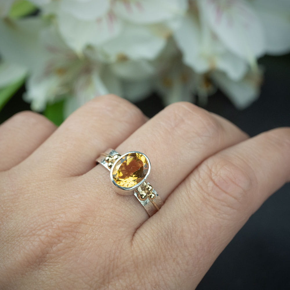 Srebrny pierścionek ze złotymi zdobieniami i cytrynem na zamówienie Pani Doroty