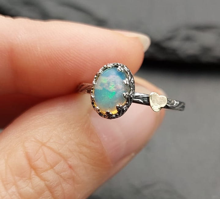 Srebrny pierścionek z opalem i złotym serduszkiem na zamówienie