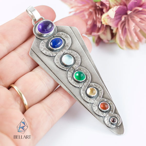 Wisior ma kształt grotu i udekorowany jest wyjątkowymi kamieniami symbolizującymi 7 czakr.