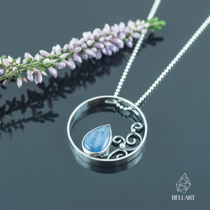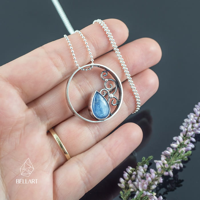 Ażurowy wisior wykonany ręcznie ze srebra. Ma on ciekawą formę koła w środku którego umieszczona jest łezka kyanitu.