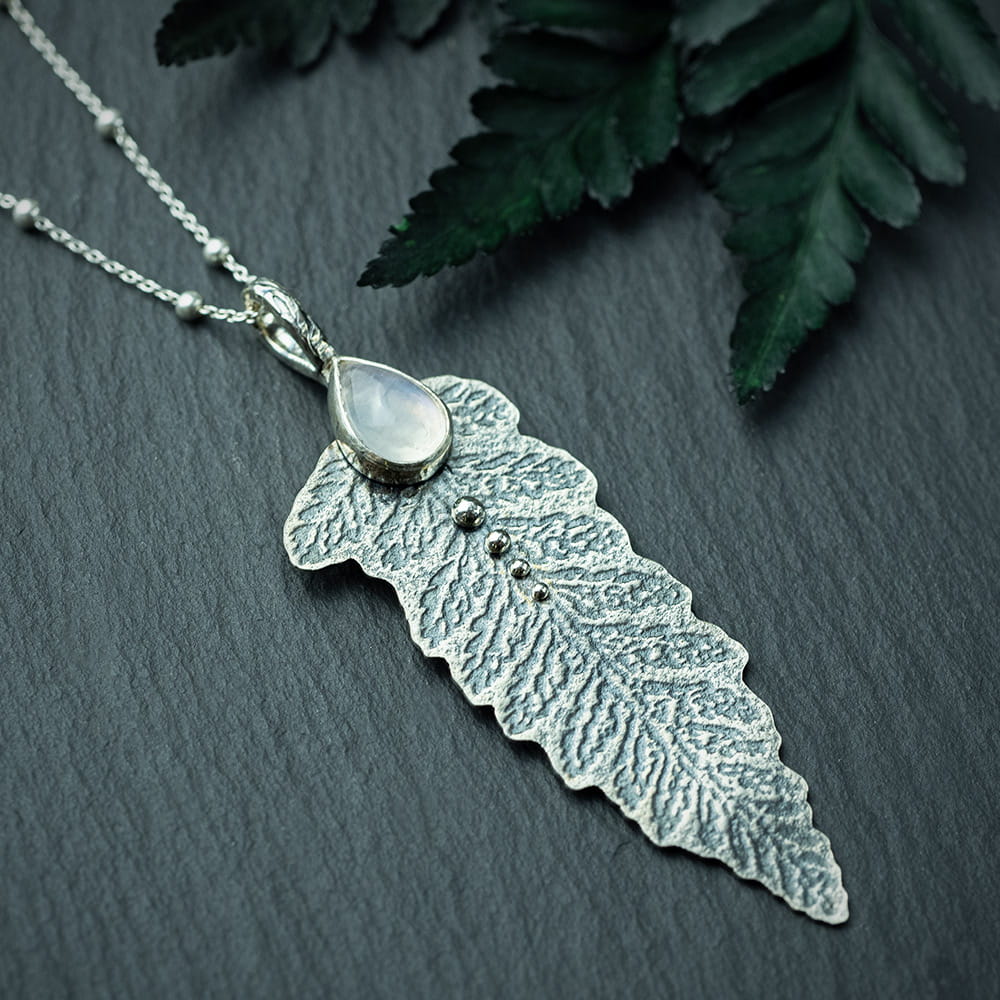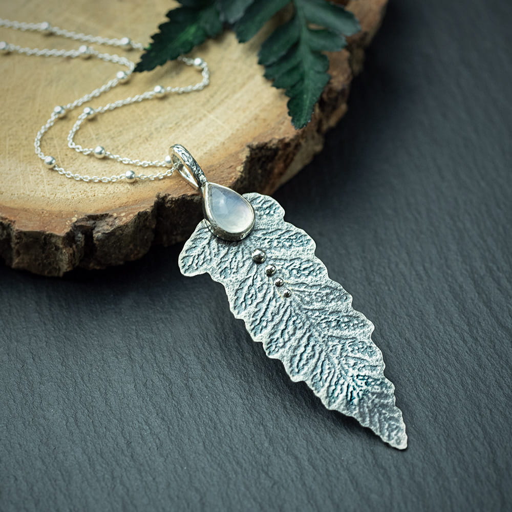 Srebrny wisior liść paproci z kamieniem księżycowym
