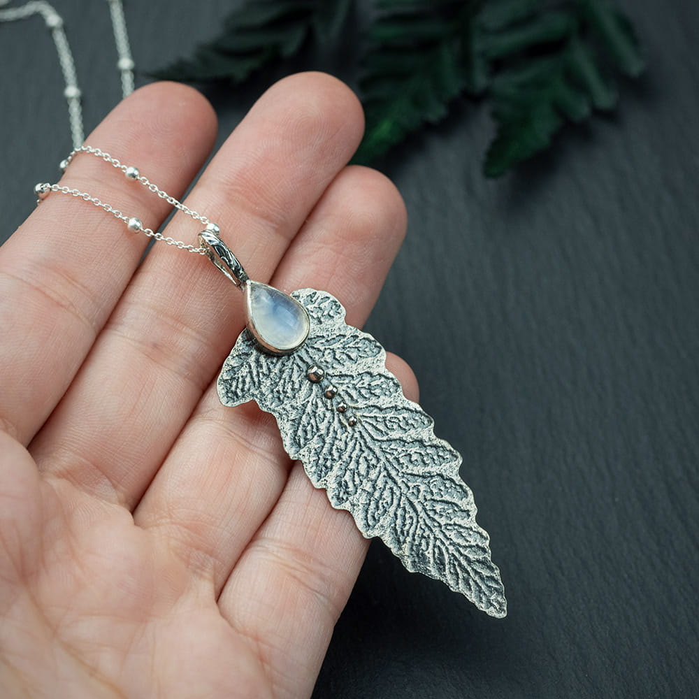 Srebrny wisior w kształcie liścia paproci z niebieskim kamieniem księżycowym