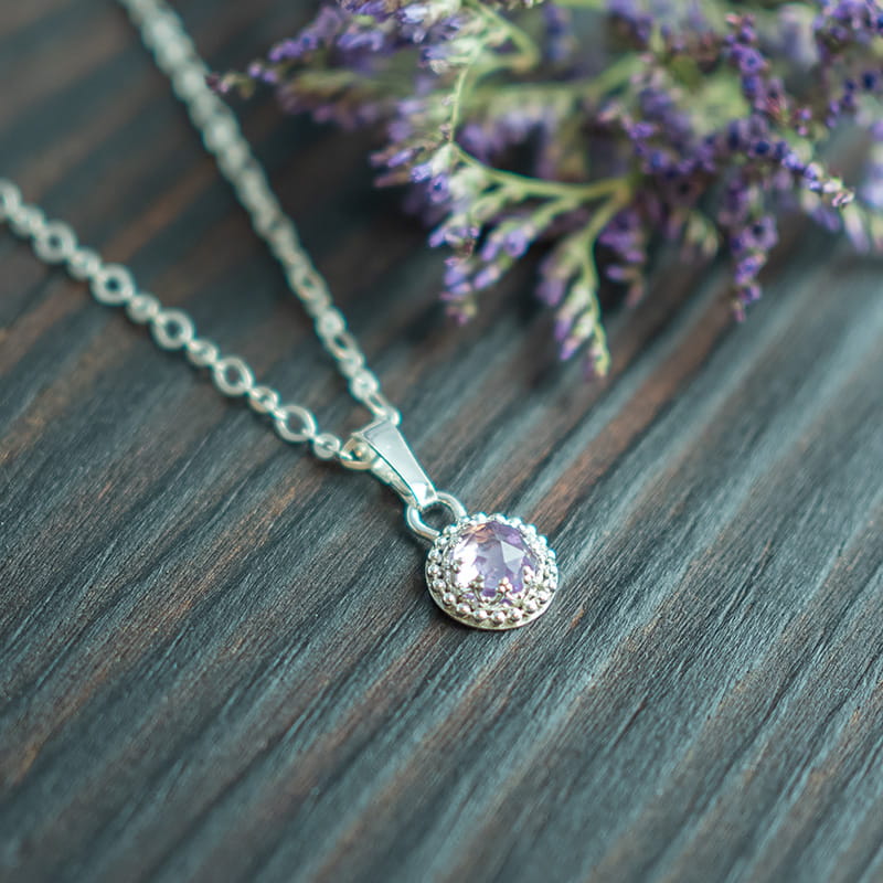 Srebrny wisiorek z lawendowym ametystem w koronce i łańcuszek wykonane na zamówienie Pani Anny.