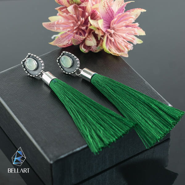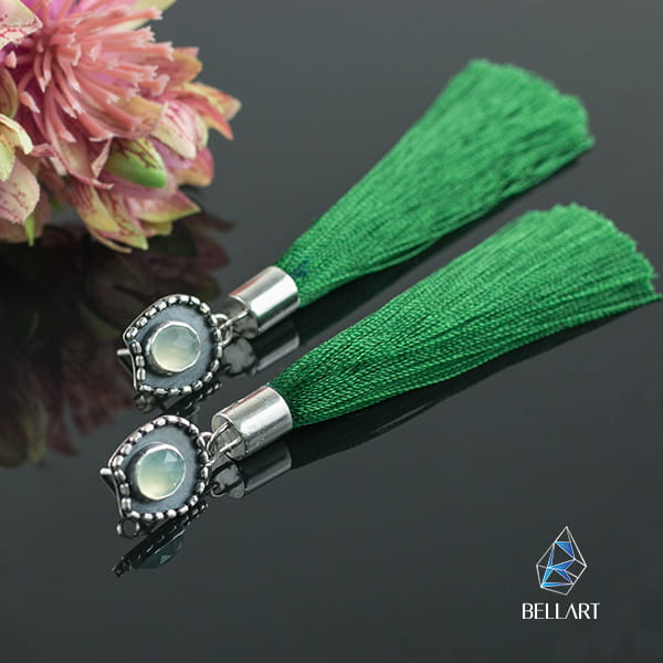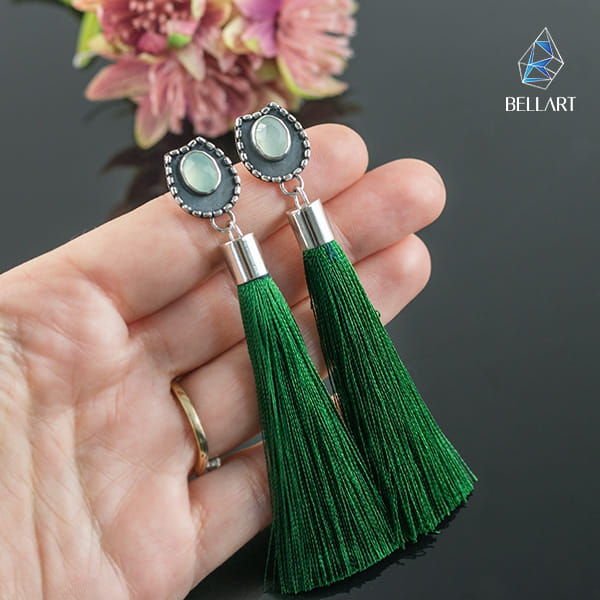 Piękne srebrna kolczyki z szmaragdowym chwostem. Kolczyki sztyfty ozdobione agatem aqua pięknie połyskują i idealnie łącza się z satynowym chwostem. Kolczyki są niepowtarzalną ozdobą wieczorową, ale tez do bardziej codziennych stylizacji.