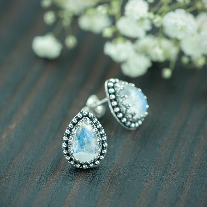 Piękne, srebrne sztyfty z kamieniem księżycowym. Wykonane ręcznie - przy użyciu technik złotniczych, w mojej pracowni. Główną ozdobą są w nich kamienie księżycowe w kształcie łezki. Mają one mocną, niebieską poświatę, która zmienia się w zależności od kąta padania światła. Ażurowa oprawa przypominająca koronę i drobne kulki nadają całości romantycznego i kobiecego charakteru. Jeśli jesteś miłośniczką wyjątkowych kamieni księżycowych te srebrne kolczyki będą idealnym zakupem. Sprawdzą się jako biżuteria do pracy czy na randkę. Finezyjny wzór oprawy i piękny kamień księżycowy to połączenie, które dopełni wiele stylizacji. Jeśli lubisz efektowne i wygodne sztyfty sprawdź też inne propozycje dostępne w sklepie.