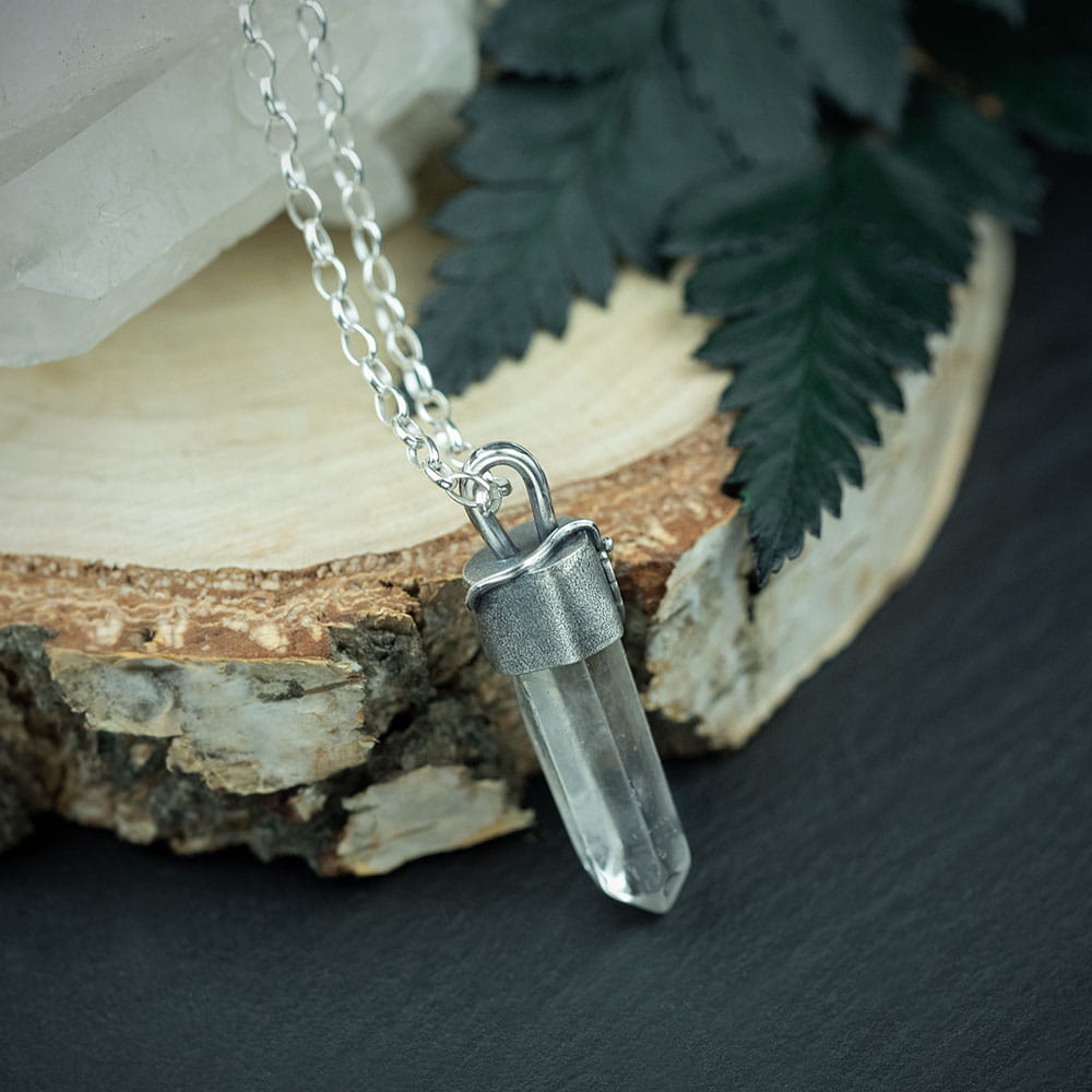 Srebrny wisior z kryształem górskim i listkiem na zamówienie Adama i Alicji