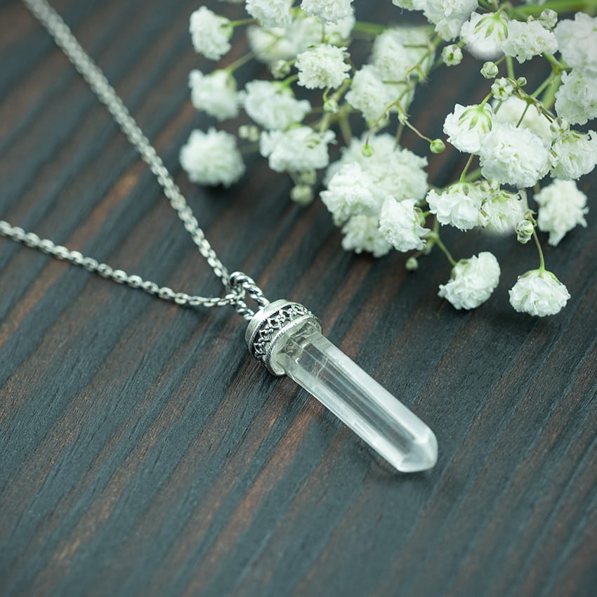 Wymiary: kryształ górski 2.6x0.5 cm, długość wisiora z zawieszką 3.5 cm, łańcuszek 61 cm + 2.5 cm przedłużenia. Na Twoje życzenie mogę zmienić wzór lub długość łańcuszka - proszę, poinformuj mnie o tym przed zakupem.