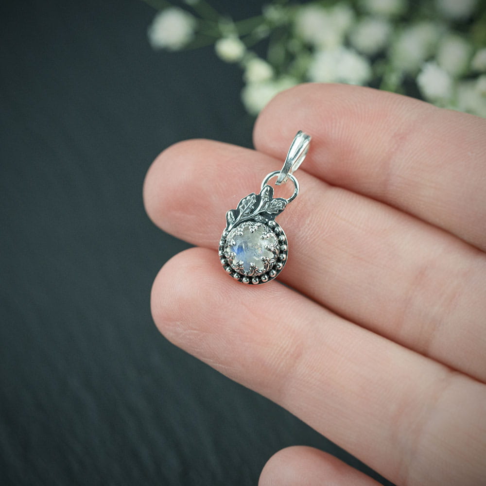 Wymiary: kamień księzycowy 6mm, wielkość całości około 1.3x1 cm, bez łańcuszka.