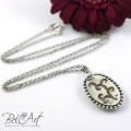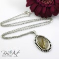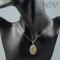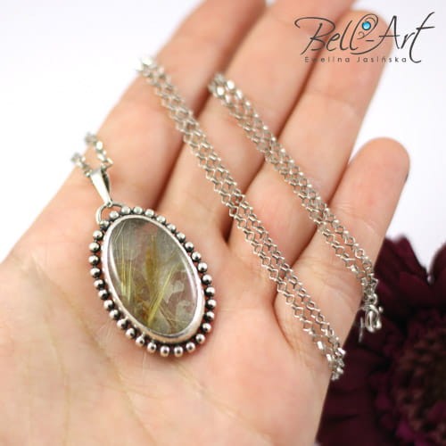 Elegancki i wyjątkowy wisior wykonany od podstaw ręcznie ze srebra próby 925 i 999. Ozdobiony dużym, owalnym kwarcem z rutylem, który otoczony został srebrnymi kuleczkami. Kwarc posiada wewnątrz “igiełki” rutylu, które połyskują złotym kolorem. Na tylnej ściance wisiora wycięty został ciekawy wzór, który umożliwia przenikanie światła przez kamień. Srebro jest lekko oksydowane (przyciemnione) i wypolerowane na połysk. Wisior stanowi wyjątkową ozdobę i przyciąga uwagę. Do wisiora dołączony jest pasujący łańcuszek.