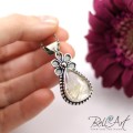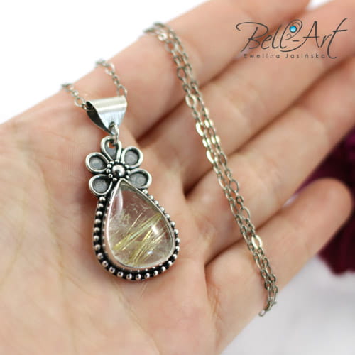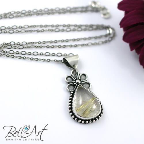 Piękny wisior wykonany od podstaw ręcznie ze srebra próby 925 oraz 999. Główną częścią jest w nim kwarc z rutylem w kształcie łezki, który został zwieńczony w górnej części ozdobnym elementem przypominającym kwiat. Kwarc otaczają również delikatne, srebrne kuleczki. Rutyl pojawia się w kamieniu w postaci złotych igiełek. Wisior posiada otwór w tylnej ściance dzięki czemu światło może przez niego przenikać i rozświetlać od wewnątrz podkreślając złote wzory z rutylu. Srebro zostało lekko zoksydowane (przyciemnione), przetarte w wypukłych miejscach i wypolerowane na połysk. Do wisiora dostępny jest również pasujący pierścionek.