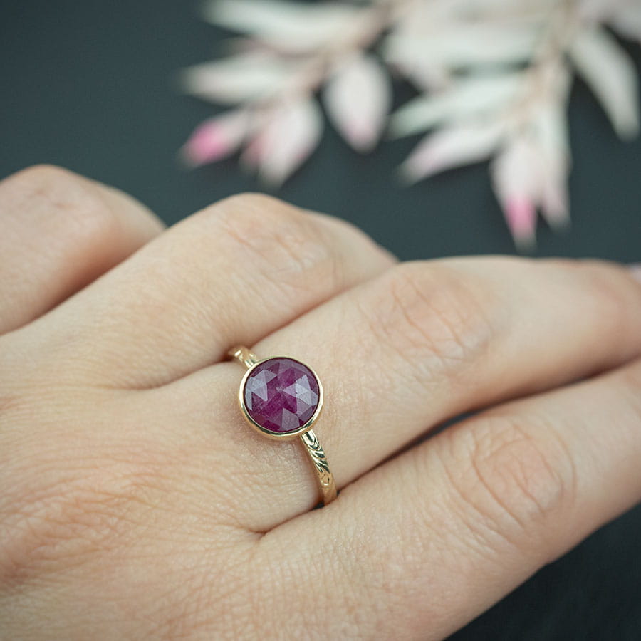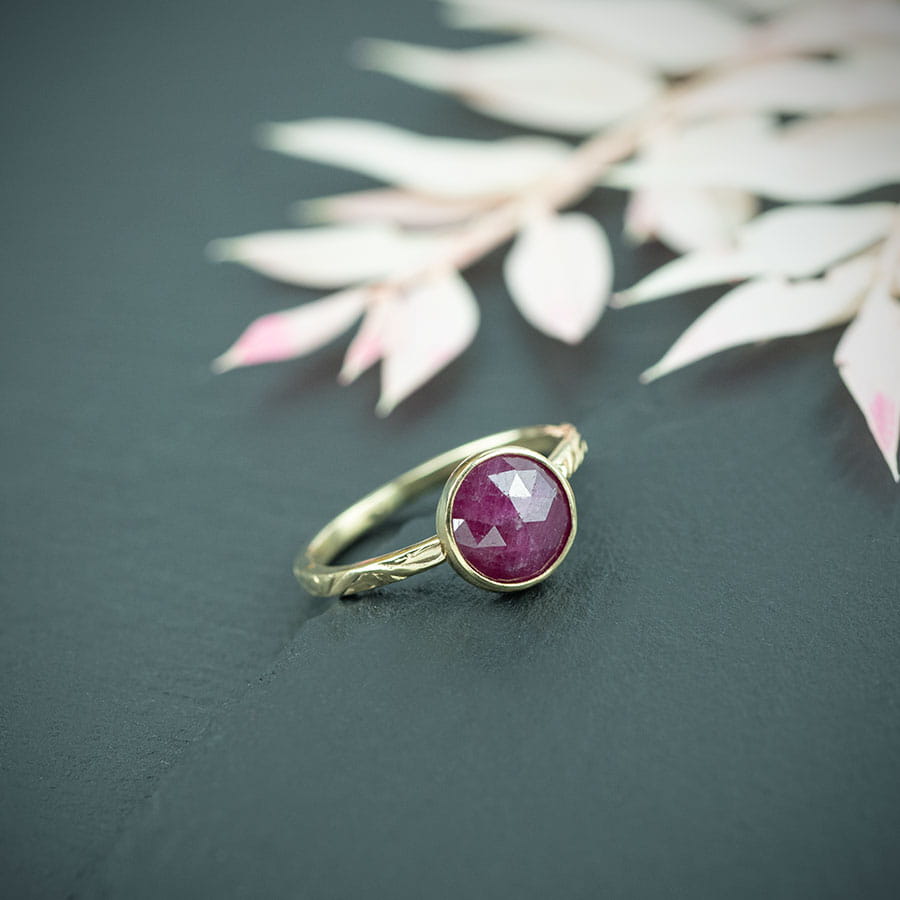 Złoty pierścionek z rubinem zdobiony wzorem Flora na zamówienie.