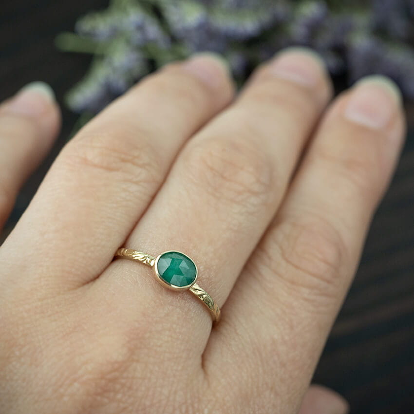 Złoty pierścionek ze szmaragdem i zdobioną obrączką